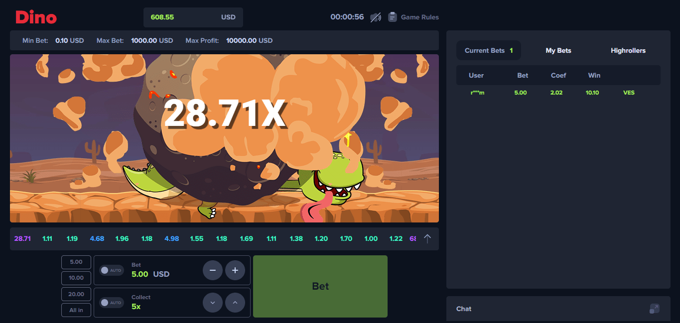 Starting the Game To begin, players select a bet amount from $0.2 to $1000. Higher bets potentially return bigger payouts. Next, click the Start button and watch as adorable Dino springs into action while the multiplier steadily ticks upward. At any point, players can click the cash out button to collect winnings relative to the current multiplier level and original bet. But be quick โ wait too long, and Dino will go extinct in a fiery asteroid blast!